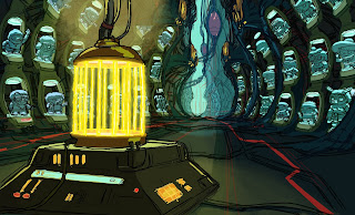 Future Granny Danny's lair concept sketch from the 'Assassin Parrot' episode shows off her collection of Danny's from infinite universe's. We came up with at least 120 different Danny's or more, my favorite being poodle Danny or Cosmic Danny. Next one is a rough stomach interior sketch for the "O' Brother Here Art Thou" episode introducing Shucks Hayseed who is a tapeworm feasting on the insides of Danny. At one point Danny starts feeling really sick so within the red stalk forrest I wanted to show some ghastly acid pits. As Danny pounds some Gatorade, red glowing balls descend upon our characters acting as electrolytes. Next are some rough sketchbook pages of mine comped together with the final version of Solip Nihilios, born from a super nova and eater of stars. This took many hands to perfect, and went through dozens of design changes but this was my favorite character of the season by far. He needed to look ethereal, otherworldly, ominous yet still emote softly by episodes end once Paco and Ruby make him develop feelings. And lastly a rough of the gigantic, mutated bunny rabbit as seen in "The World According to Larp".